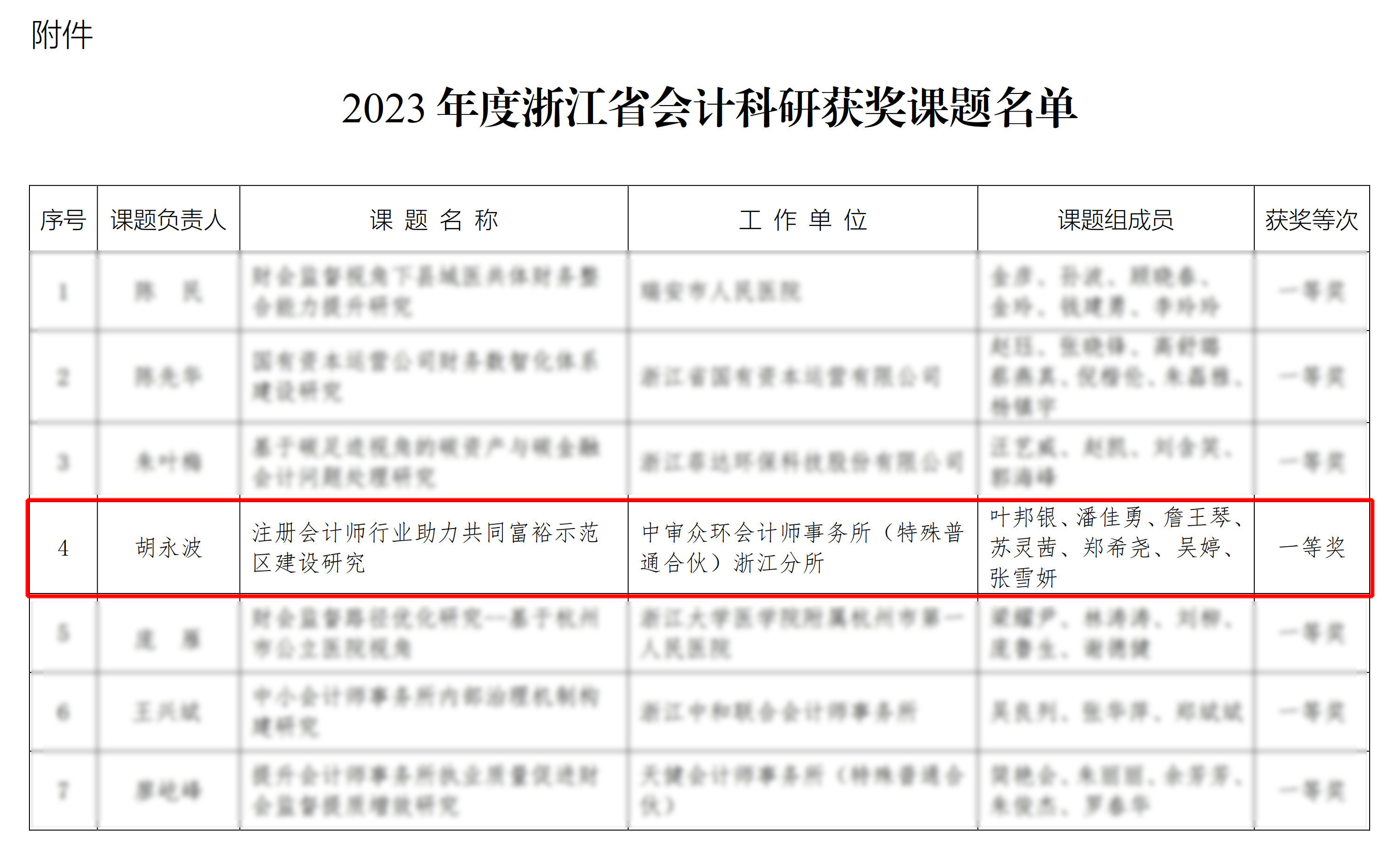 2023年度浙江省会计科研课题评审结果日前公布,南京审计大学中审学院叶邦银教授与中审众环会计师事务所(特殊普通合伙)合伙人胡永波(浙江分所),共同申请并完成的《注册会计师行业助力共同富裕示范区建设研究》课题荣获一等奖。与此同时,叶邦银教授还与中审众环江苏分所李云斌、宋娟、都晓芳,共同入选了江苏省注册会计师行业50人师资库。